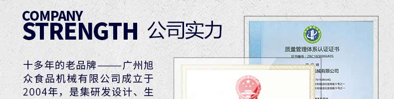 廣州旭眾食品機(jī)械有限公司是一家集科研開(kāi)發(fā),生產(chǎn)設(shè)計(jì),營(yíng)銷(xiāo)服務(wù)為一體的現(xiàn)代化生產(chǎn)企業(yè)?,F(xiàn)代化生產(chǎn)車(chē)間,精湛制造技術(shù),所產(chǎn)機(jī)械歷經(jīng)市場(chǎng)重重考驗(yàn),不斷贏得海內(nèi)外客戶的贊譽(yù)。