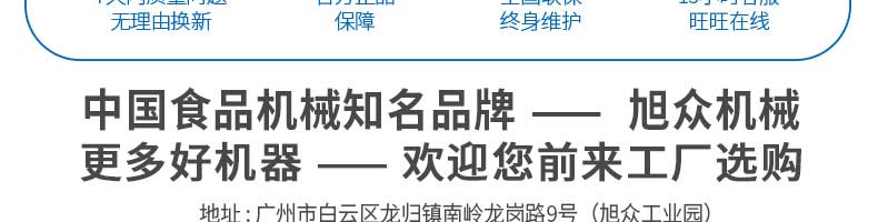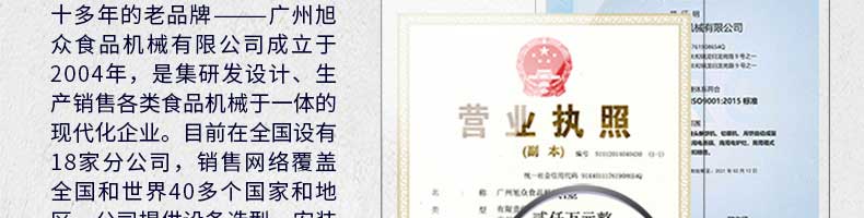 廣州旭眾食品機械有限公司是一家集科研開發(fā),生產(chǎn)設計,營銷服務為一體的現(xiàn)代化生產(chǎn)企業(yè)。現(xiàn)代化生產(chǎn)車間,精湛制造技術(shù),所產(chǎn)機械歷經(jīng)市場重重考驗,不斷贏得海內(nèi)外客戶的贊譽。