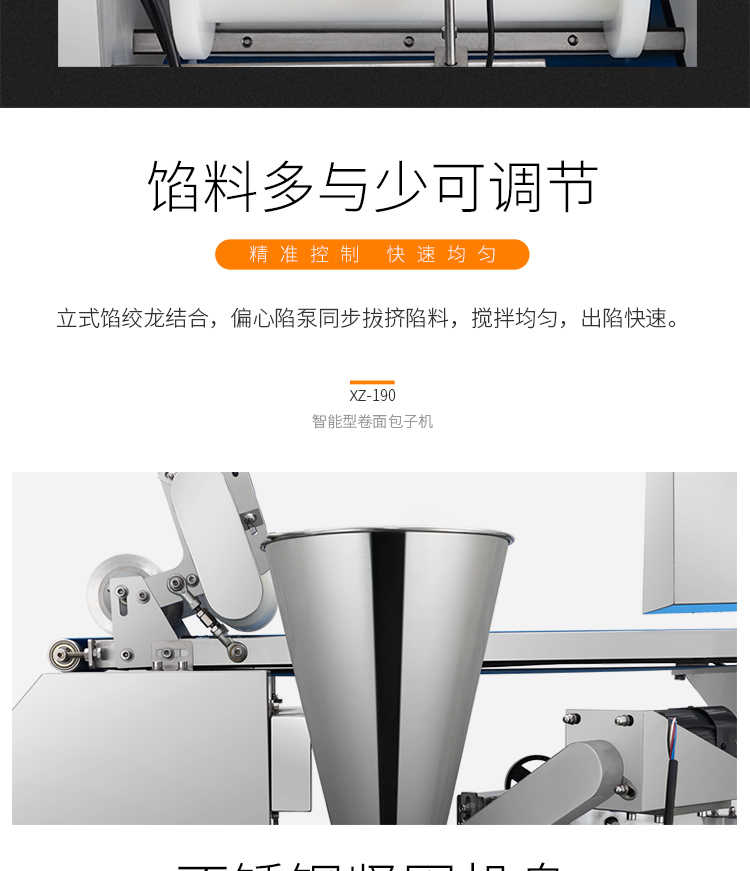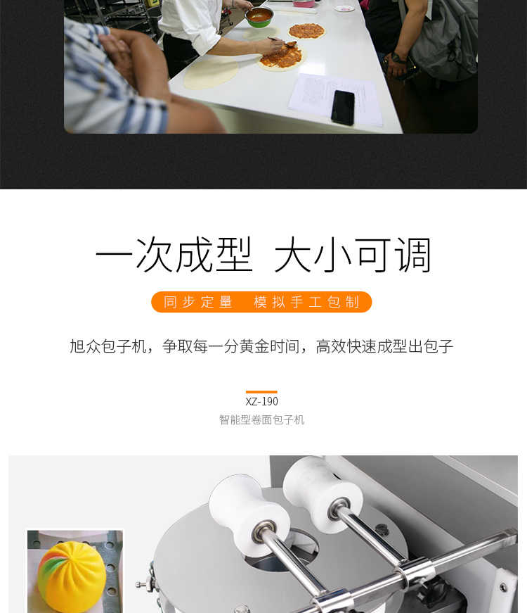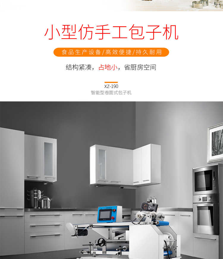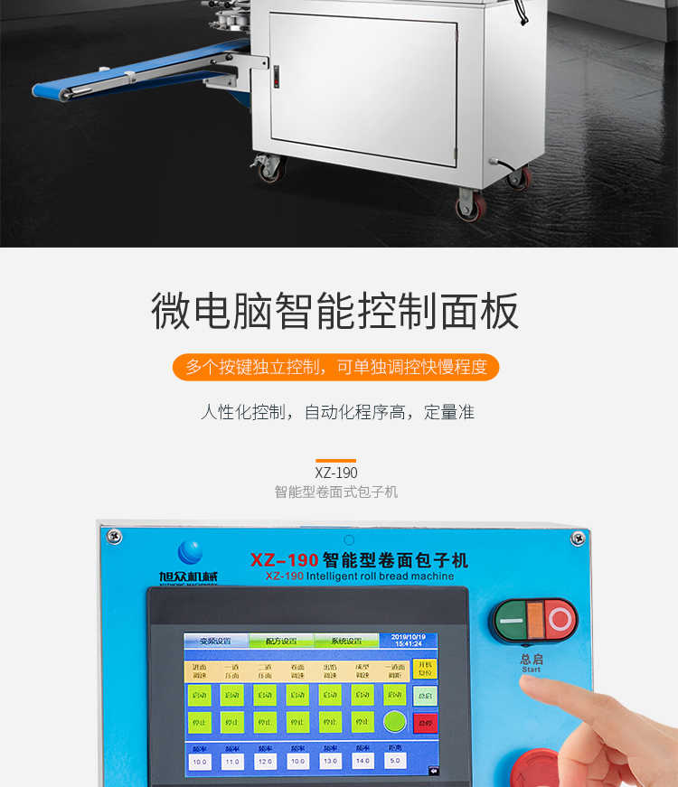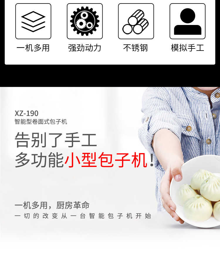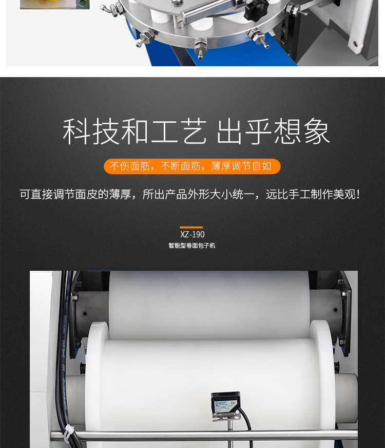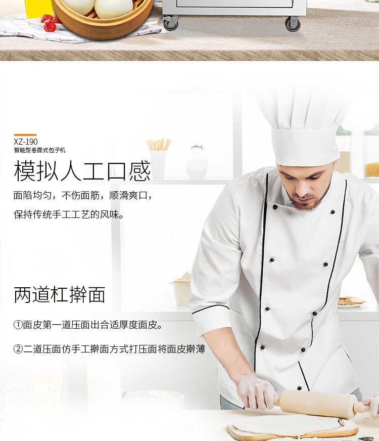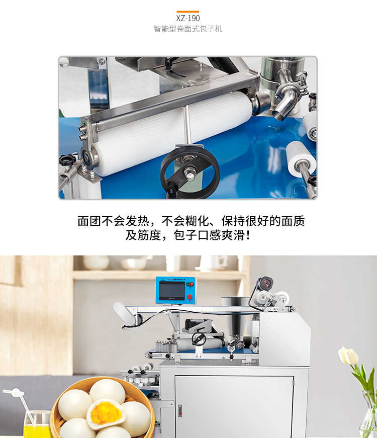 XZ-190智能型卷面式包子機,科技和工藝出乎想象不傷面筋,不斷面筋,薄厚調節(jié)自如可直接調節(jié)面皮的薄厚,所出產品外形大小統(tǒng)一,遠比手工制作美觀!