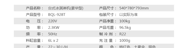 BQL-928T臺式冰淇淋機(jī),1.選用國際牌壓縮機(jī),輔以旭眾精湛工藝,大大縮短冰淇淋成型時間,高效節(jié)能;2.全新液晶智能觸控面板,簡單明了,多功能易操作;3.全新升級專業(yè)膨化泵,膨化率高,產(chǎn)量增加30%;4.一鍵清洗功能,省時方便;5.主要部件采用不銹鋼材質(zhì),時尚美觀,持久耐用;6.先進(jìn)的機(jī)械攪拌系統(tǒng),機(jī)器運(yùn)行穩(wěn)定可靠,低噪音,產(chǎn)品口感爽滑細(xì)嫩。
