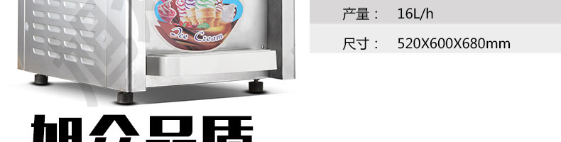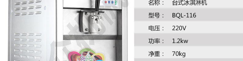 BQL-116臺(tái)式冰淇淋機(jī),●選用國際名牌成熟制冷配套件和高效壓縮機(jī),融合旭眾精湛工藝輔以嚴(yán)格的質(zhì)量控制流程,使產(chǎn)品整體性能及品質(zhì)得以全面提升?!癫捎萌珨?shù)字電腦控制系統(tǒng),選用名牌優(yōu)質(zhì)電器元件,先進(jìn)的生產(chǎn)工藝,故障診斷,軟硬任意調(diào)制,自動(dòng)修復(fù)功能,安全精確,可靠性更高。●專業(yè)成熟制冷系統(tǒng)設(shè)計(jì),選用世界名牌大功率專用壓縮機(jī),大大縮短冰淇淋成型時(shí)間,相同時(shí)間內(nèi)冰淇淋產(chǎn)量大幅度增加,使您生意火爆時(shí)依然得心應(yīng)手,為您創(chuàng)造財(cái)富?!癜踩椒€(wěn)的機(jī)械攪拌系統(tǒng),噪音更低、振動(dòng)更小,使整機(jī)運(yùn)行性能達(dá)到國際先進(jìn)水平?!翊_保進(jìn)料溫度在0°C~35°C;環(huán)境溫度5°C~40°C勻可正常使用。