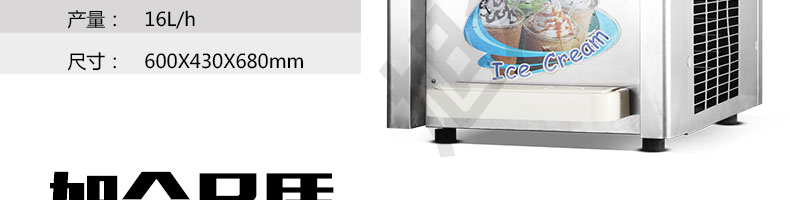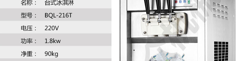 BQL-216T臺式冰淇淋機,●選用國際名牌成熟制冷配套件和高效壓縮機,融合旭眾精湛工藝輔以嚴格的質(zhì)量控制流程,使產(chǎn)品整體性能及品質(zhì)得以全面提升?!癫捎萌珨?shù)字電腦控制系統(tǒng),選用名牌優(yōu)質(zhì)電器元件,先進的生產(chǎn)工藝,故障診斷,軟硬任意調(diào)制,自動修復(fù)功能,安全精確,可靠性更高?!駥I(yè)成熟制冷系統(tǒng)設(shè)計,選用世界名牌大功率專用壓縮機,大大縮短冰淇淋成型時間,相同時間內(nèi)冰淇淋產(chǎn)量大幅度增加,使您生意火爆時依然得心應(yīng)手,為您創(chuàng)造財富?!癜踩椒€(wěn)的機械攪拌系統(tǒng),噪音更低、振動更小,使整機運行性能達到國際先進水平。●確保進料溫度在0°C~35°C;環(huán)境溫度5°C~40°C勻可正常使用。
