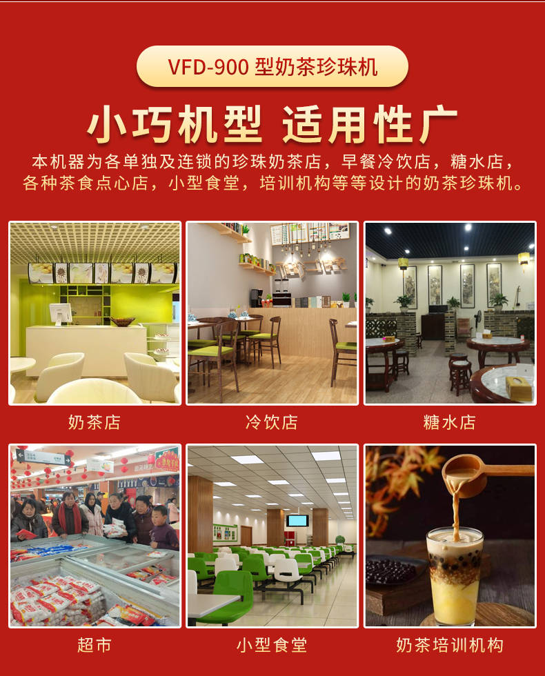 VFD-900珍珠奶茶機(jī),奶茶店、甜品店可用??缮a(chǎn)奶茶珍珠,果蔬圓子,無餡湯圓,水晶湯圓,各種芋圓。不占空間、體積小、重量輕,桌面上的小奶茶珍珠機(jī)。告別手工繁瑣的工序,省時(shí)省力,輕松解決手工麻煩,成本高等一系列問題
