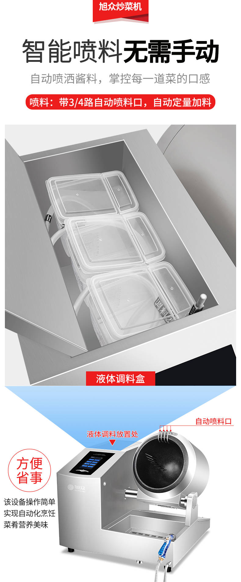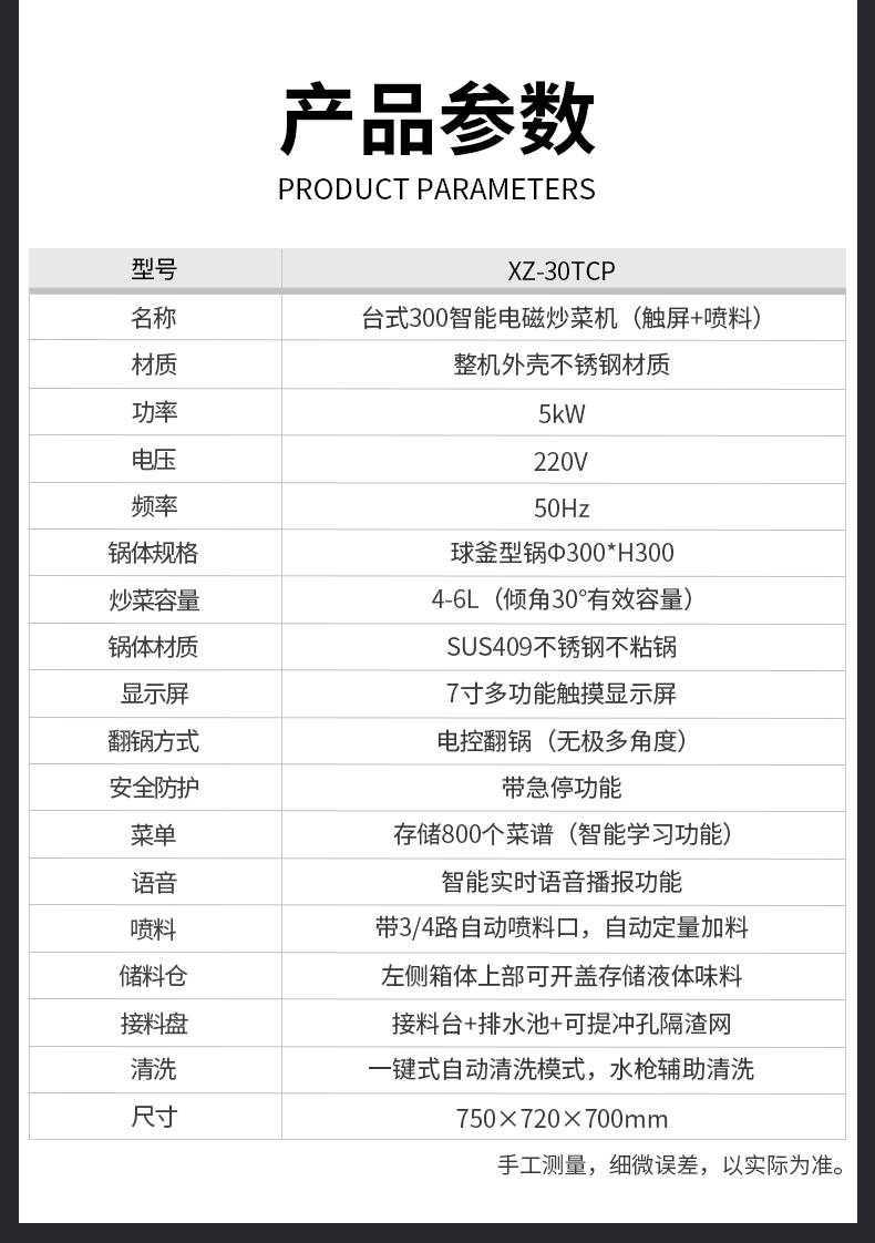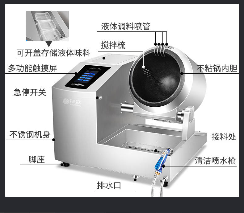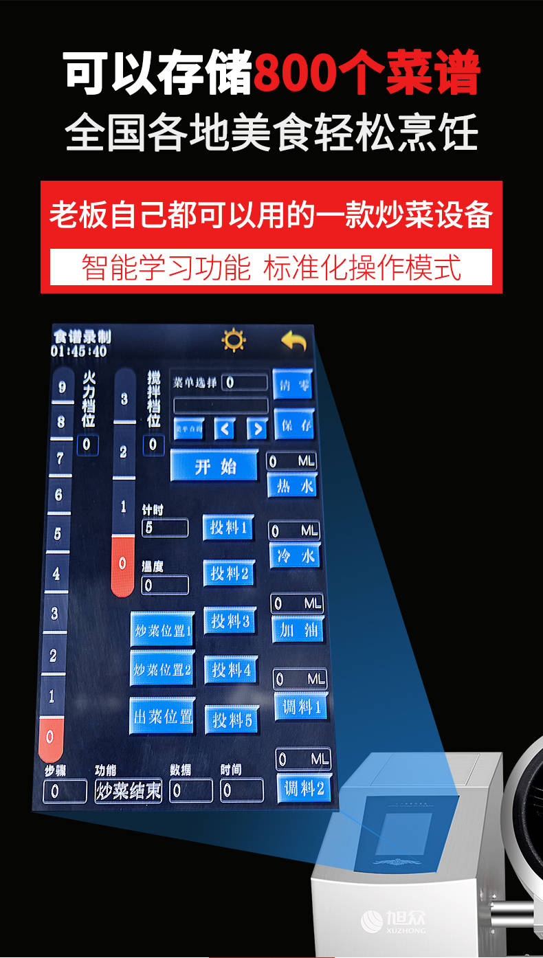 XZ-30TCP臺(tái)式300智能電磁炒菜機(jī)(觸屏+噴料),可以實(shí)現(xiàn)自動(dòng)化烹飪過程的智能化設(shè)備,語(yǔ)音播報(bào)、自動(dòng)噴料、旋轉(zhuǎn)翻炒、快速出菜。實(shí)現(xiàn)自動(dòng)化烹飪,新一代微電腦操控智能烹飪?cè)O(shè)備、顛覆傳統(tǒng)炒菜模式。5000W猛火爆炒美食更鮮香