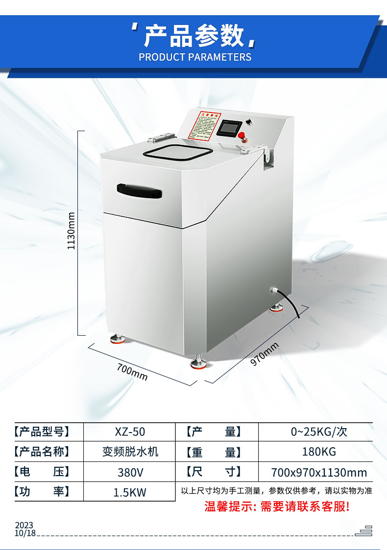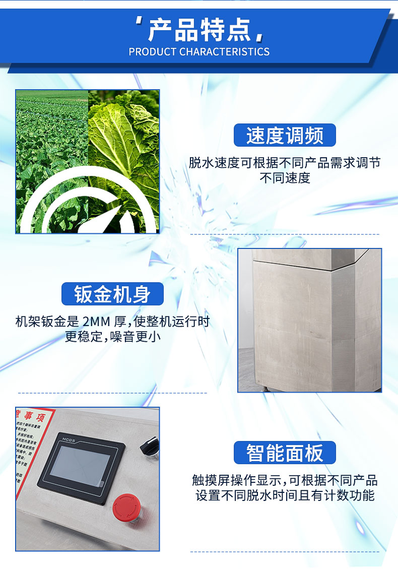 XZ-50型脫水機,蔬菜脫水食品甩干,變頻控制、方便快捷。速度調(diào)頻,脫水速度可根據(jù)不同產(chǎn)品需求調(diào)節(jié)不同速度。鈑金機身,機架鈑金是 2MM 厚,使整機運行時更穩(wěn)定,噪音更小。