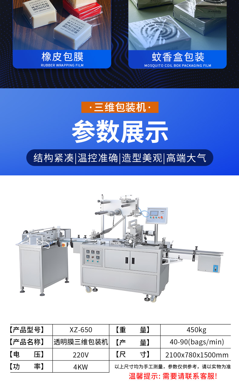 XZ-650包裝機(jī),三維包裝機(jī),全自動化操作出膜、切膜、包膜、熱封一次完成??蓮V泛應(yīng)用多種產(chǎn)品,適用包裝的產(chǎn)品有食品、撲克牌、香煙盒化妝品、日用品、文具用品等類型產(chǎn)品。