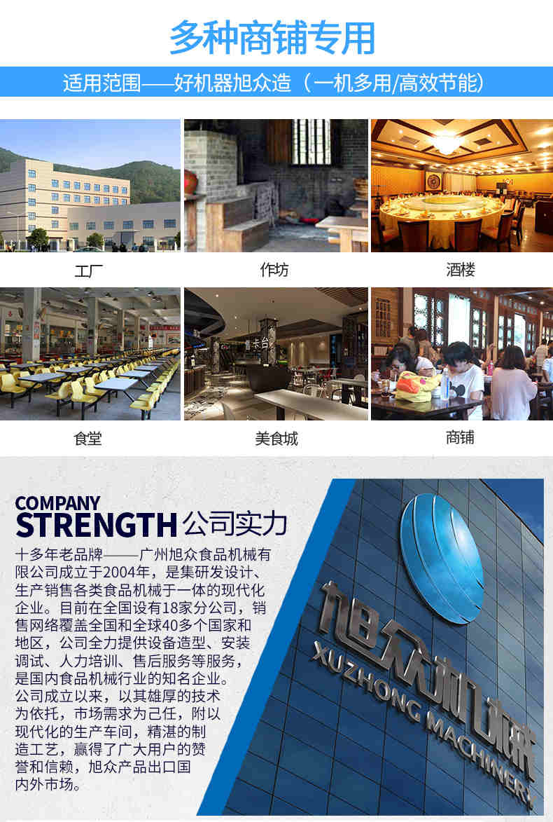 廣州旭眾食品機械有限公司是一家集科研開發(fā),生產(chǎn)設(shè)計,營銷服務(wù)為一體的現(xiàn)代化生產(chǎn)企業(yè)?,F(xiàn)代化生產(chǎn)車間,精湛制造技術(shù),所產(chǎn)機械歷經(jīng)市場重重考驗,不斷贏得海內(nèi)外客戶的贊譽。
