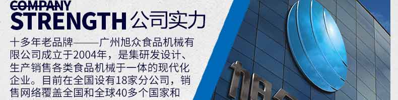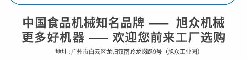 廣州旭眾食品機械有限公司是一家集科研開發(fā),生產設計,營銷服務為一體的現(xiàn)代化生產企業(yè)。現(xiàn)代化生產車間,精湛制造技術,所產機械歷經市場重重考驗,不斷贏得海內外客戶的贊譽。