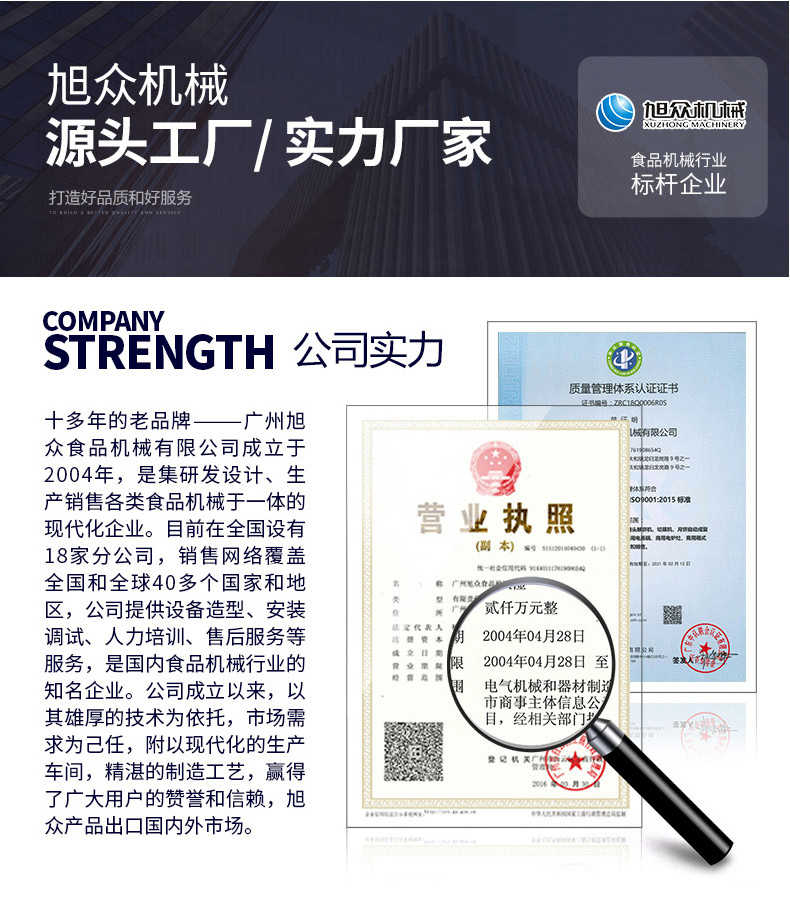 廣州旭眾食品機械有限公司是一家集科研開發(fā),生產(chǎn)設計,營銷服務為一體的現(xiàn)代化生產(chǎn)企業(yè)?,F(xiàn)代化生產(chǎn)車間,精湛制造技術(shù),所產(chǎn)機械歷經(jīng)市場重重考驗,不斷贏得海內(nèi)外客戶的贊譽。
