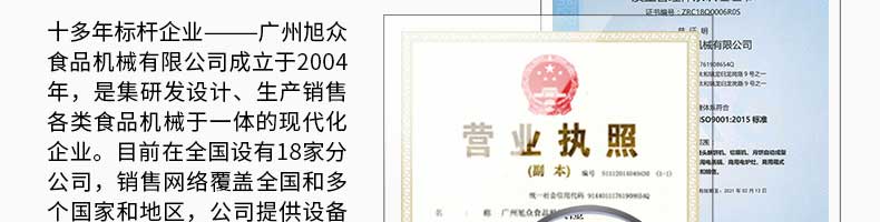 廣州旭眾食品機械有限公司是一家集科研開發(fā),生產(chǎn)設(shè)計,營銷服務(wù)為一體的現(xiàn)代化生產(chǎn)企業(yè)?,F(xiàn)代化生產(chǎn)車間,精湛制造技術(shù),所產(chǎn)機械歷經(jīng)市場重重考驗,不斷贏得海內(nèi)外客戶的贊譽。