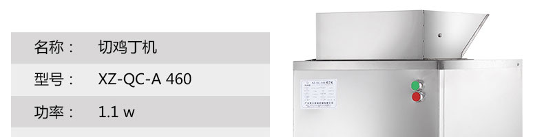 XZ-QC-A460切丁機,切雞丁機適合將帶軟骨的禽類,如雞、鴨、鵝、鴿、魚類等切成塊(?。?。本系列設備工作效率高,采用不銹鋼制作,美觀耐用,切割快速,少碎骨。
