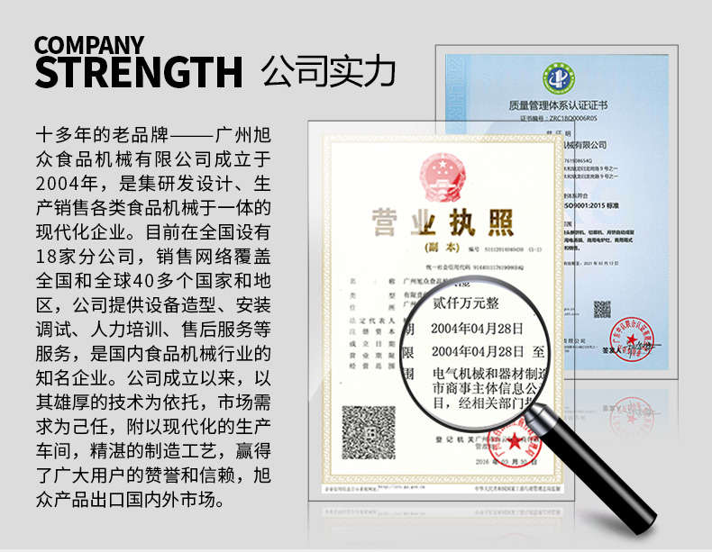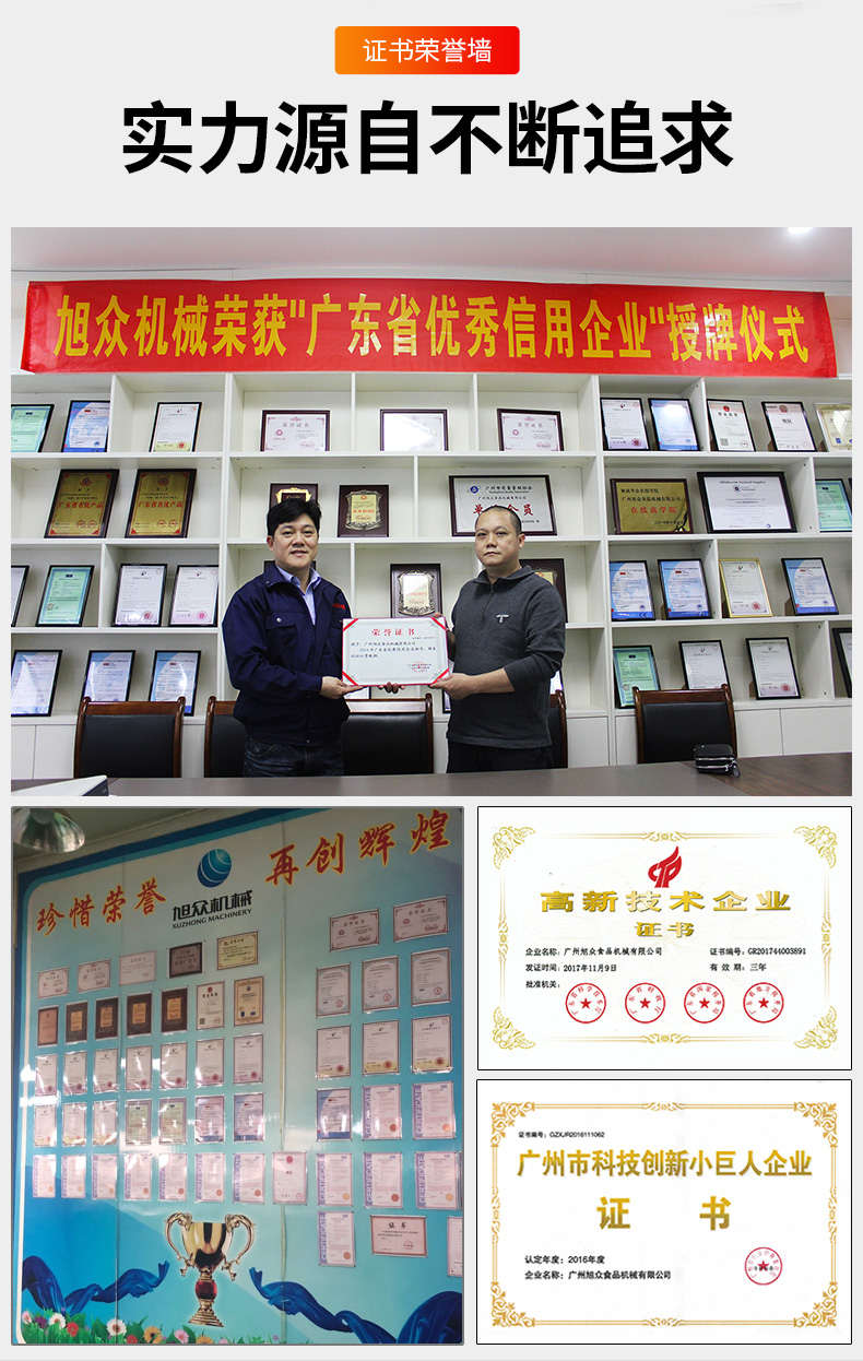 廣州旭眾食品機(jī)械有限公司是一家集科研開發(fā),生產(chǎn)設(shè)計(jì),營銷服務(wù)為一體的現(xiàn)代化生產(chǎn)企業(yè)?,F(xiàn)代化生產(chǎn)車間,精湛制造技術(shù),所產(chǎn)機(jī)械歷經(jīng)市場(chǎng)重重考驗(yàn),不斷贏得海內(nèi)外客戶的贊譽(yù)。