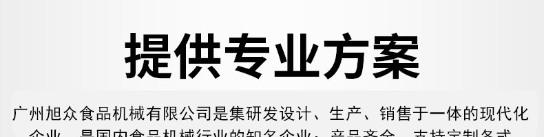 廣州旭眾食品機械有限公司是一家集科研開發(fā),生產(chǎn)設(shè)計,營銷服務(wù)為一體的現(xiàn)代化生產(chǎn)企業(yè)?,F(xiàn)代化生產(chǎn)車間,精湛制造技術(shù),所產(chǎn)機械歷經(jīng)市場重重考驗,不斷贏得海內(nèi)外客戶的贊譽。