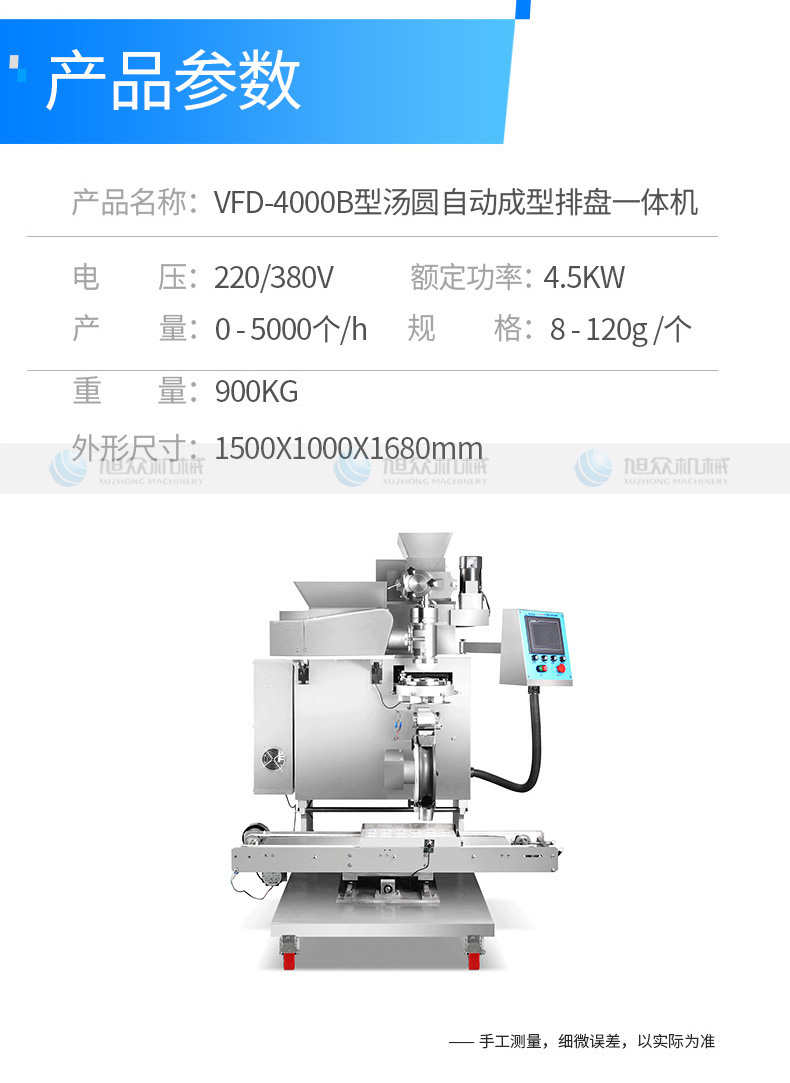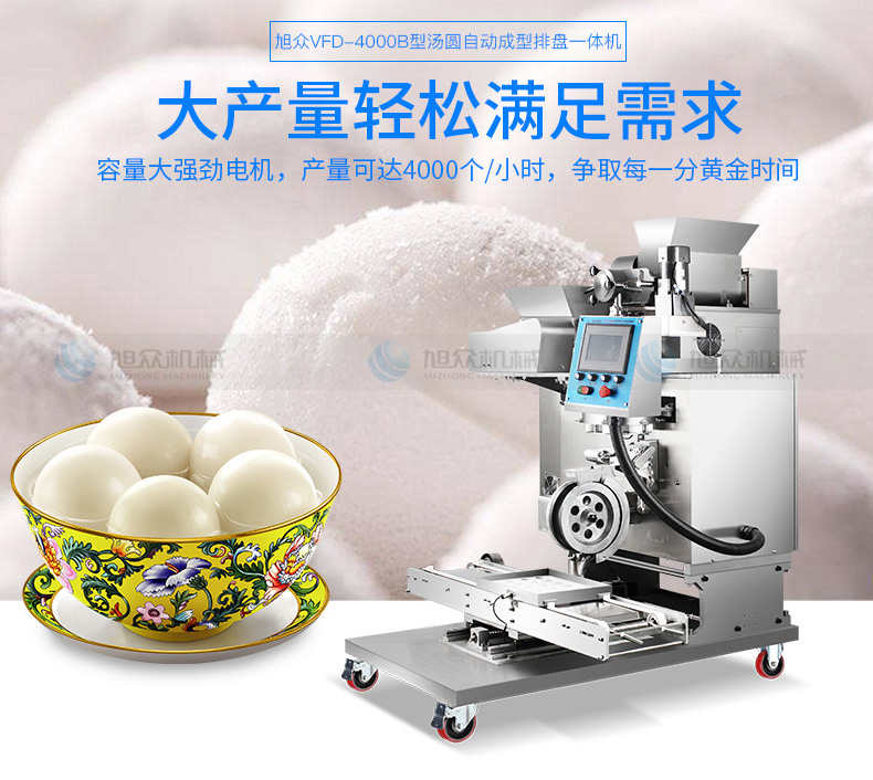 VFD-4000B湯丸機(jī),告別手工時(shí)代旭僉多功能湯圓機(jī)輕松解決問(wèn)題。大產(chǎn)量輕松滿足需求容量大強(qiáng)勁電機(jī),產(chǎn)量可達(dá)4000個(gè)小時(shí),爭(zhēng)取每一分黃金時(shí)間