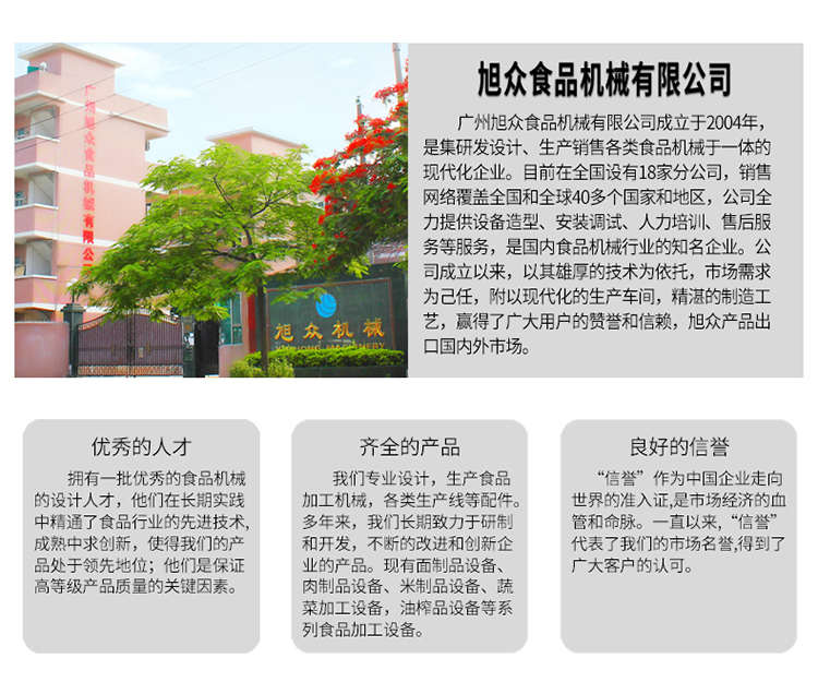 廣州旭眾食品機(jī)械有限公司是一家集科研開(kāi)發(fā),生產(chǎn)設(shè)計(jì),營(yíng)銷(xiāo)服務(wù)為一體的現(xiàn)代化生產(chǎn)企業(yè)?,F(xiàn)代化生產(chǎn)車(chē)間,精湛制造技術(shù),所產(chǎn)機(jī)械歷經(jīng)市場(chǎng)重重考驗(yàn),不斷贏得海內(nèi)外客戶的贊譽(yù)。