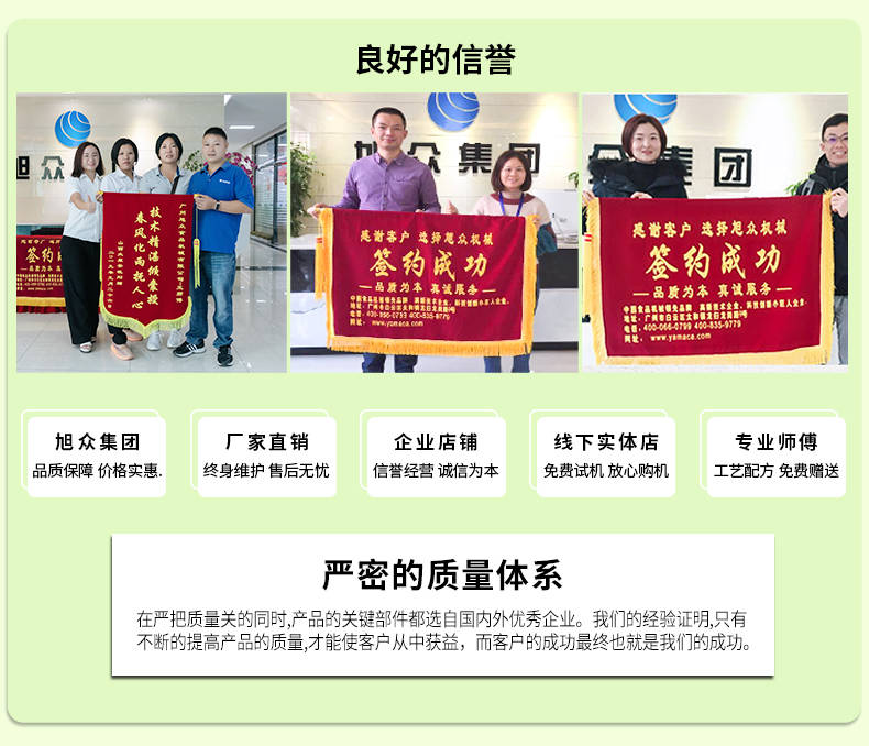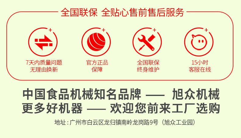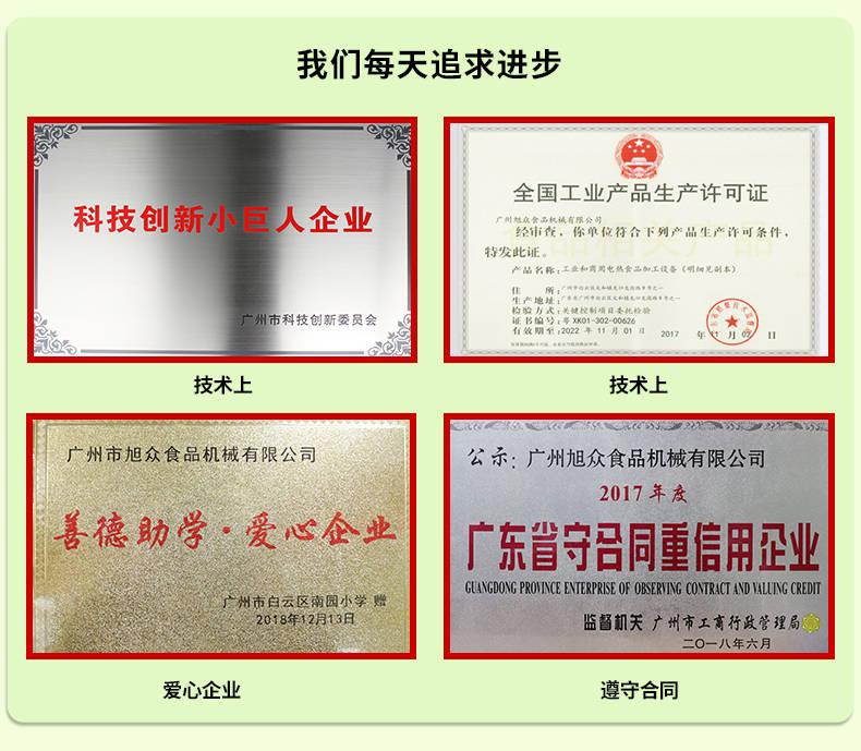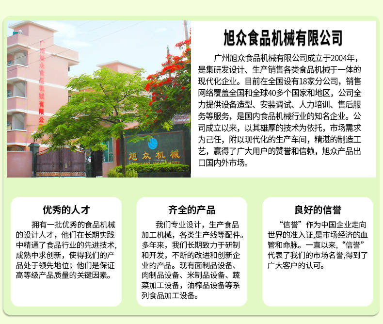 廣州旭眾食品機(jī)械有限公司是一家集科研開發(fā),生產(chǎn)設(shè)計(jì),營(yíng)銷服務(wù)為一體的現(xiàn)代化生產(chǎn)企業(yè)?,F(xiàn)代化生產(chǎn)車間,精湛制造技術(shù),所產(chǎn)機(jī)械歷經(jīng)市場(chǎng)重重考驗(yàn),不斷贏得海內(nèi)外客戶的贊譽(yù)。