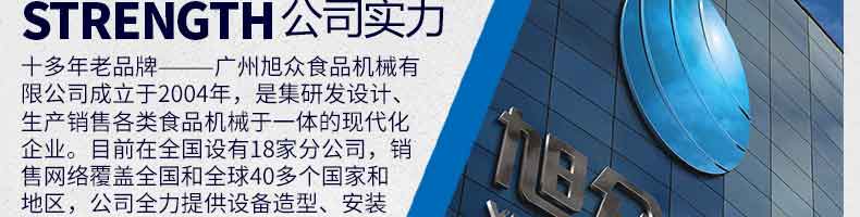廣州旭眾食品機械有限公司是一家集科研開發(fā),生產(chǎn)設(shè)計,營銷服務(wù)為一體的現(xiàn)代化生產(chǎn)企業(yè)。現(xiàn)代化生產(chǎn)車間,精湛制造技術(shù),所產(chǎn)機械歷經(jīng)市場重重考驗,不斷贏得海內(nèi)外客戶的贊譽。