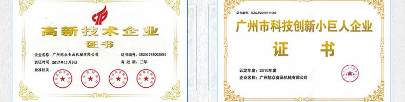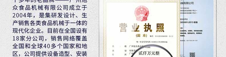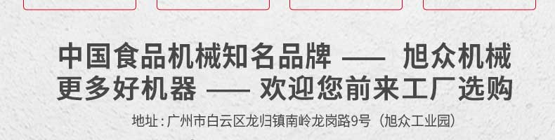 廣州旭眾食品機(jī)械有限公司是一家集科研開發(fā),生產(chǎn)設(shè)計,營銷服務(wù)為一體的現(xiàn)代化生產(chǎn)企業(yè)?,F(xiàn)代化生產(chǎn)車間,精湛制造技術(shù),所產(chǎn)機(jī)械歷經(jīng)市場重重考驗(yàn),不斷贏得海內(nèi)外客戶的贊譽(yù)。