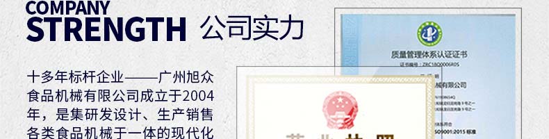 廣州旭眾食品機(jī)械有限公司是一家集科研開(kāi)發(fā),生產(chǎn)設(shè)計(jì),營(yíng)銷服務(wù)為一體的現(xiàn)代化生產(chǎn)企業(yè)。現(xiàn)代化生產(chǎn)車間,精湛制造技術(shù),所產(chǎn)機(jī)械歷經(jīng)市場(chǎng)重重考驗(yàn),不斷贏得海內(nèi)外客戶的贊譽(yù)。
