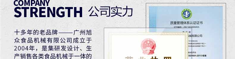 廣州旭眾食品機(jī)械有限公司是一家集科研開發(fā),生產(chǎn)設(shè)計(jì),營銷服務(wù)為一體的現(xiàn)代化生產(chǎn)企業(yè)。現(xiàn)代化生產(chǎn)車間,精湛制造技術(shù),所產(chǎn)機(jī)械歷經(jīng)市場重重考驗(yàn),不斷贏得海內(nèi)外客戶的贊譽(yù)。