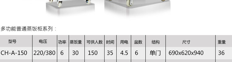 CH-A多功能普通蒸飯柜,適用于大米、面制品、肉類(lèi)、海鮮類(lèi)等。深受賓館、飯店、工廠、機(jī)關(guān)食堂、部隊(duì)、大專院校等單位的歡迎。