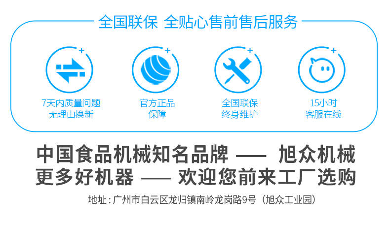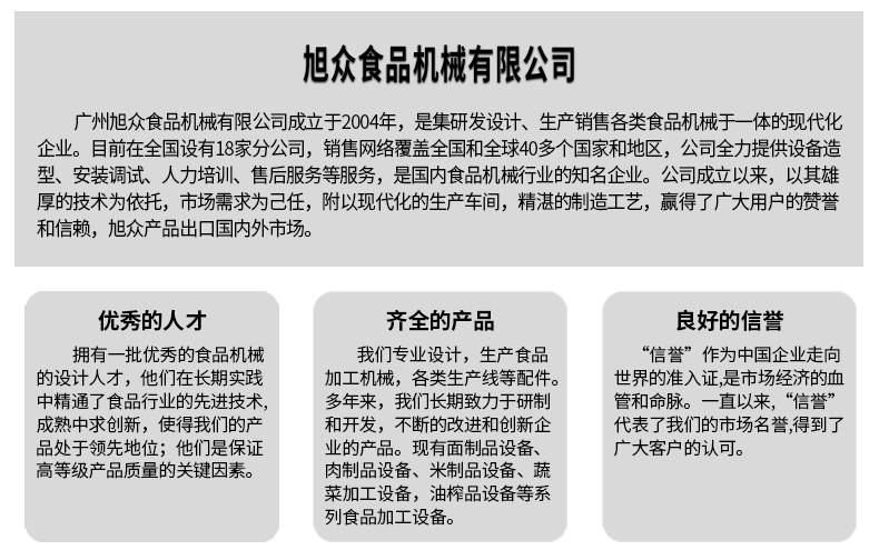 廣州旭眾食品機械有限公司是一家集科研開發(fā),生產(chǎn)設(shè)計,營銷服務(wù)為一體的現(xiàn)代化生產(chǎn)企業(yè)?,F(xiàn)代化生產(chǎn)車間,精湛制造技術(shù),所產(chǎn)機械歷經(jīng)市場重重考驗,不斷贏得海內(nèi)外客戶的贊譽。